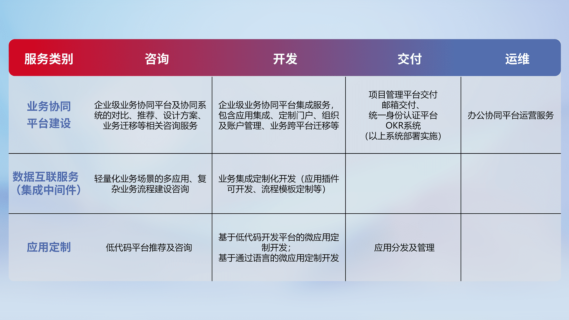 针对钉钉、、、、企微、、IDaas等平台级产品提供产品的规划、、方案、、交付、、、定制化开发等服务,,,实现如统一协同办公、、、、智能客户服务、、混合会议管理、、智能数据查询、、等业务场景,,,实现数字化转型。。
