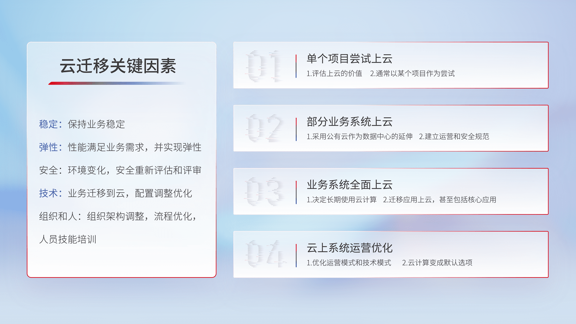 结合实际业务,,,,从规划设计、、云平台选型、、、、云原生改造、、、、数据迁移、、、集成交付,,,迁移全过程为客户识别最佳上云路径,,,,做好风险识别管理,,设计网络架构、、身份权限、、、安全审计合规、、、操作审计、、、日志审计、、监控告警策略、、、、多站点容灾设计等,,,,对云上基础设施进行整体规划,,,提升IT治理水平,,以满足弹性、、高可用、、高性能的需求。。。。